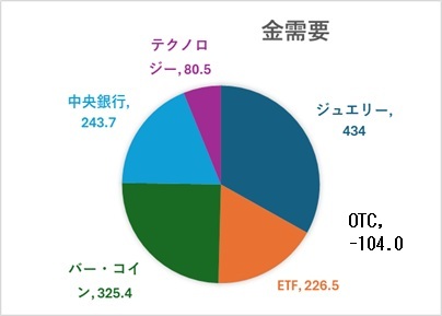 金の需要は、大きく「ジュエリー(装飾品)」「投資」「中央銀行」「テクノロジー」の3つに分類され、それ以外の用途は「OTC(店頭取引)」として扱われます。